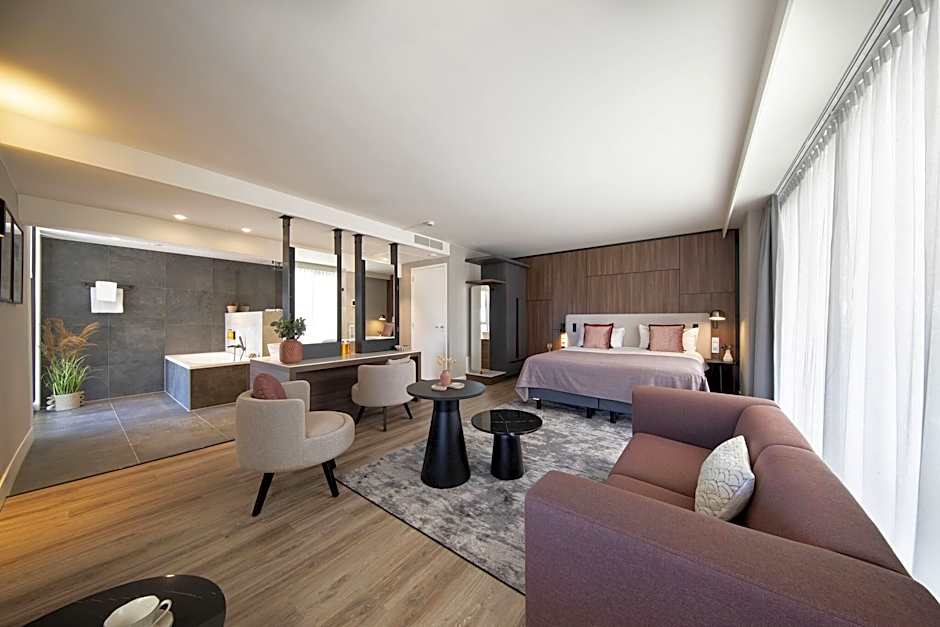 Spacious Suite of 48M2 equipped with Kingsize bed, connecting lounge with workstation, Smart TV plus Chromecast, balcony and luxurious bathroom with Rituals bath products.